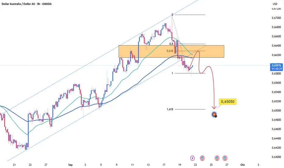 Dengan latar teknikal ini, saya tidak memperkirakan harga akan mampu merebut kembali support lama yang kini telah berubah menjadi resistance. Penolakan yang jelas di area tersebut bisa memicu penurunan berikutnya, dengan target proyeksi di sekitar 0,65050, sejalan sempurna dengan ekstensi Fibonacci 1.618.