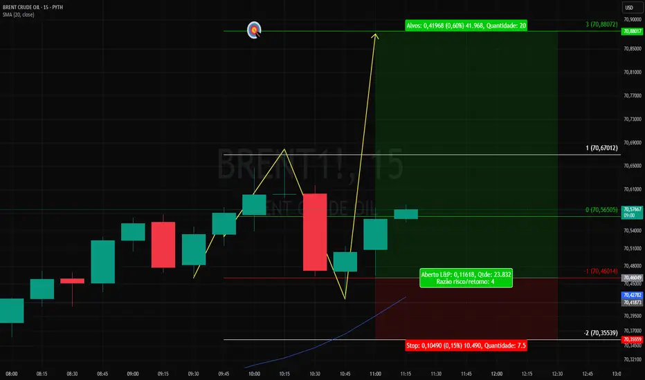 No gráfico de 5 minutos do BRENT1!, ocorreu um rompimento de alta (brooks) com projeção da sequência de Fibonacci de seu pivô, rompeu a linha branca 1 dessa projeção,retraiu para um 4/1 e poderá voltar a subir.