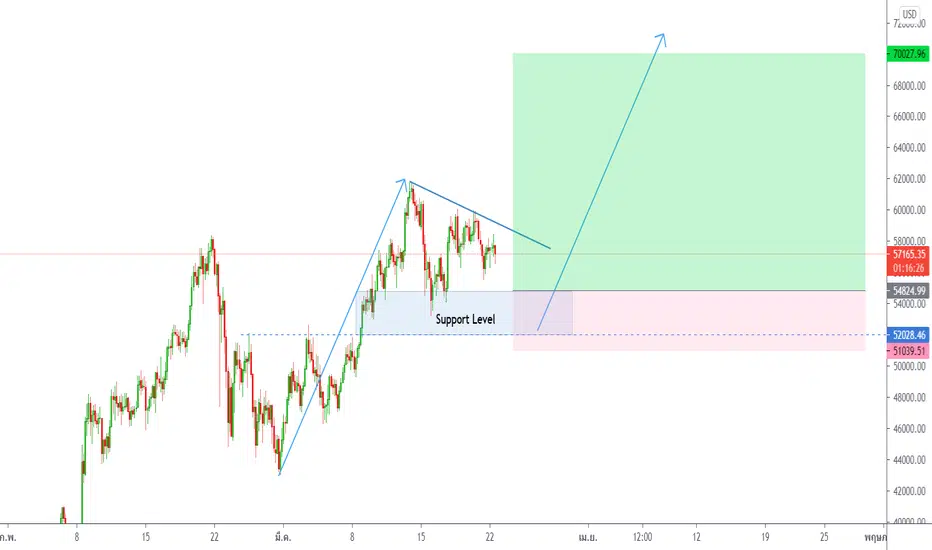 ราคาบิทยังคงอยู่ในแนวโน้มขาขึ้นชัดเจนโดยไม่ต้องสงสัย ราคาปรับตัวขึ้นอย่างต่อเนื่อง ทำลาย High แล้ว High อีก ตอนนี้ได้มองเห็นรูปแบบของราคาหลังจากการพักตัวเกิดขึ้น นั่นคือราคากำลังเคลื่อนตัวเข้าสู่กรอบสามเหลี่ยมในแนวโน้มขาขึ้น แสดงถึงแพทเทิลราคาของการขึ้นอย่างต่อเนื่อง โดยฐานของราคาในรอบนี้คือ 52000 - 55000 คือ Support Level เป็นจุดที่ราคามีโอกาสย่อลงมาทดสอบแล้วกลับตัวขึ้นที่โซนนี้ ส่วนราคาเป้าหมายตามเทคนิค ฐานถึงยอด ก็จะขึ้นไปประมาณเท่าๆ กัน คือ 70000 บิท ทั้งหมดนี้เป็นเพียงการวิเคราะห์ทางเทคนิคเท่านั้น การบริหารจัดการความเสี่ยงสำคัญที่สุดครับ