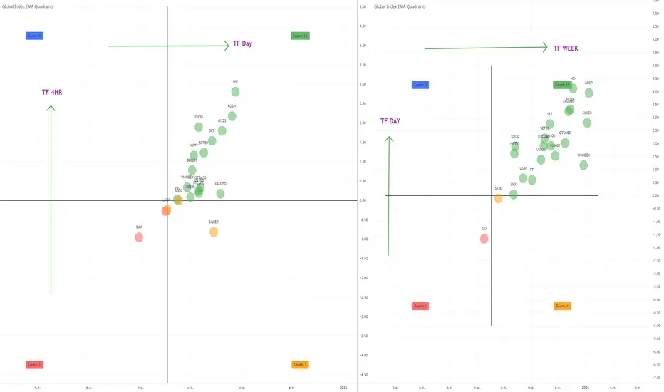 ภาพซ้ายซึ่งใช้ TF ที่เร็วกว่า แสดงให้เห็นว่าหลายสินทรัพย์ — ไม่ว่าจะเป็นหุ้น ทอง หรือค่าเงิน — เริ่มทยอยปรับตัวลงอย่างเห็นได้ชัด