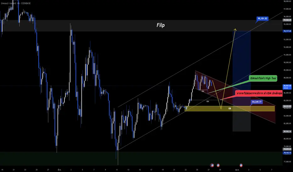 แต่ราคาก็วิ่งขึ้นไปได้แค่ 87,806 $ แล้วก็มีแท่งเทียนกลับตัว หากราคาจะไปต่อจากตรงนี้ควรจะยืนเหนือ 88,200 $ หากไม่เป็นเช่นนี้ ราคาก็จะลงมาตาม กรอบเทรนไลน์ Side way Dow ตามโครงสร้างMinor