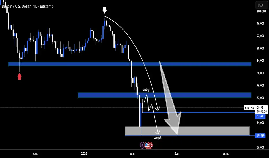 ตราบใดที่ BTC ยังไม่สามารถกลับไปยืนเหนือโซน 80k+ ได้อย่างแข็งแรง โครงสร้างตลาดยังคงสนับสนุน การลงต่อ การรีบาวด์จึงควรถูกมองเป็น โอกาสในการขาย มากกว่าการกลับตัวของเทรนด์