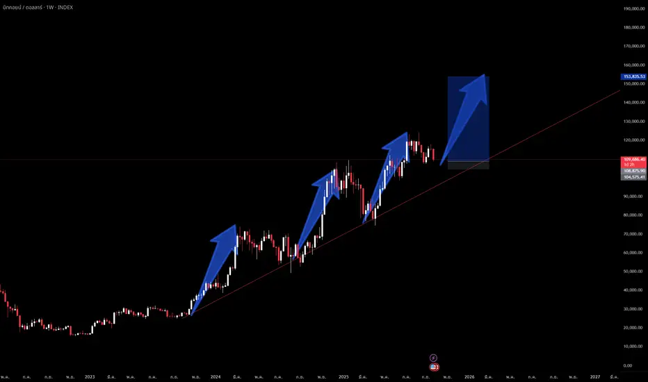 จาก TF W เราจะเห็นได้ชัดว่าเป็นการ Expension ขึ้นมาเสมอ แล้วการ Expension ส่วนใหญ่มักจะมีระยะที่เท่า ๆกันเสมอ หาก จากนี้ BTC จะไปต่อ เป้าที่ไปถึงโดยประมาณ 150,000 $