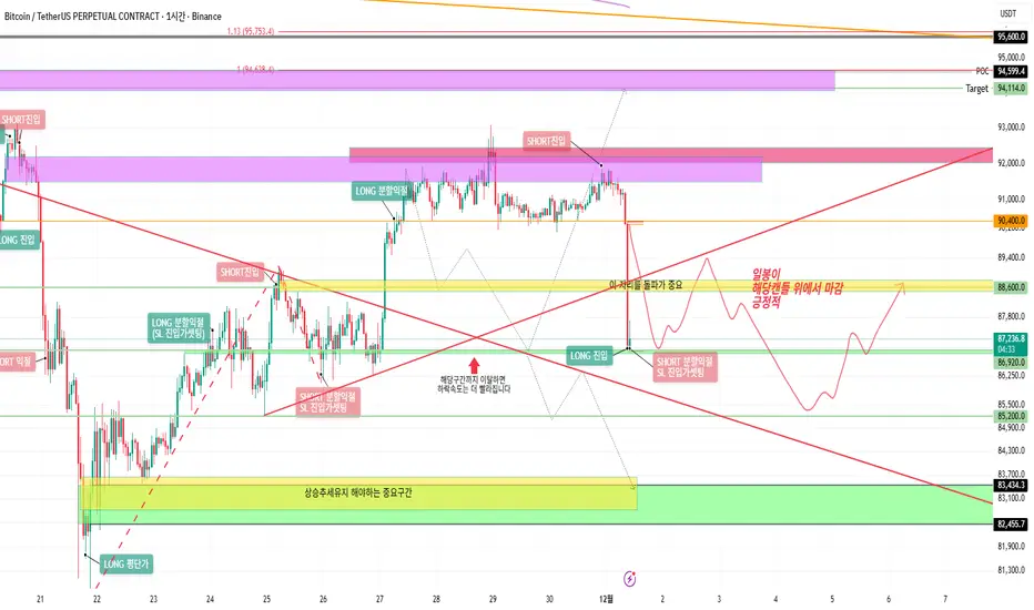 적어도 지금 자리에서 88.6K 까지 반등 후 85K까지 하락해줘야 반등흐름이 강하게 나올 수 있습니다.