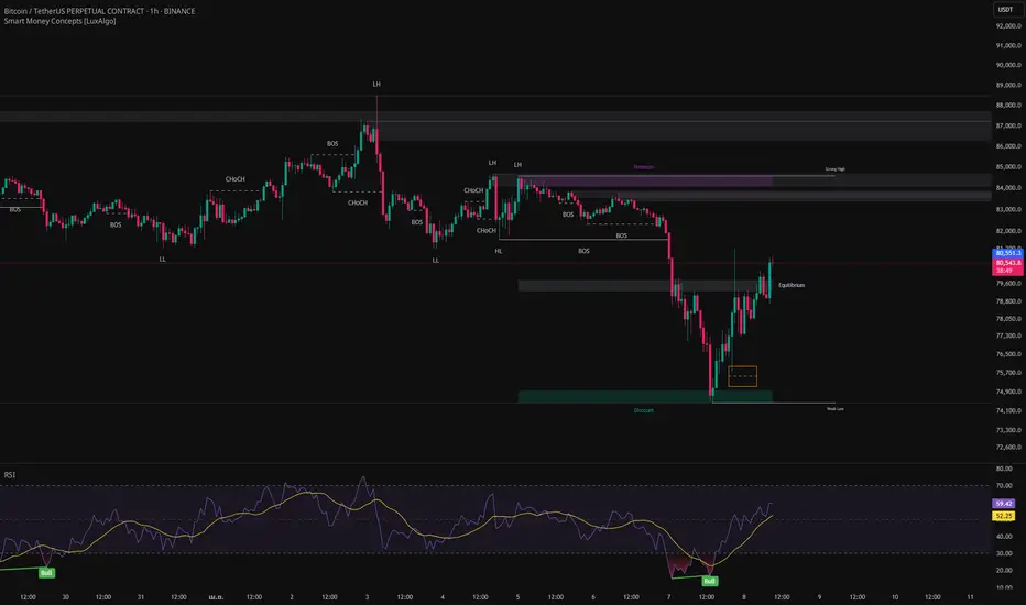 ✅ แนวโน้มล่าสุด: เกิด BOS ยืนยัน การกลับตัวเป็นขาขึ้น (Bullish) บน TF15-1H จาก BOS ที่ราคา 80,400