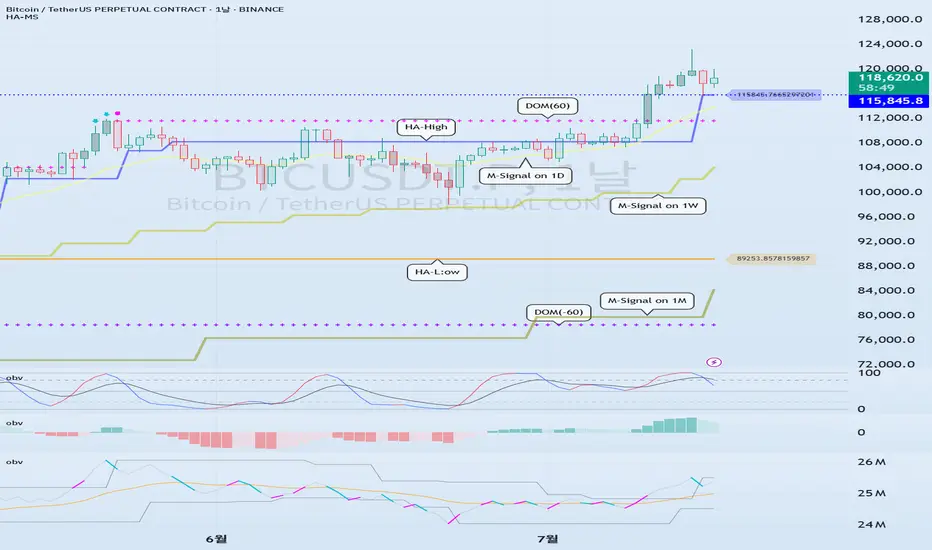 즉, 현재 1D 차트의 HA-High 지표는 115845.8 지점에 생성되어 있기 때문에 115845.8 지점을 기준으로 가격이 위에 있는지 아래에 있는지에 따라 대응 방안을 달리 생각해야 한다는 겁니다.