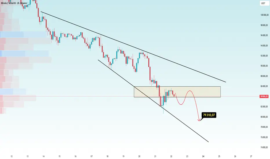 Il a balayé la faible zone de demande située entre 84 200 et 84 800 et teste actuellement ce niveau, formant un rebond technique et une figure de continuation baissière marquée.