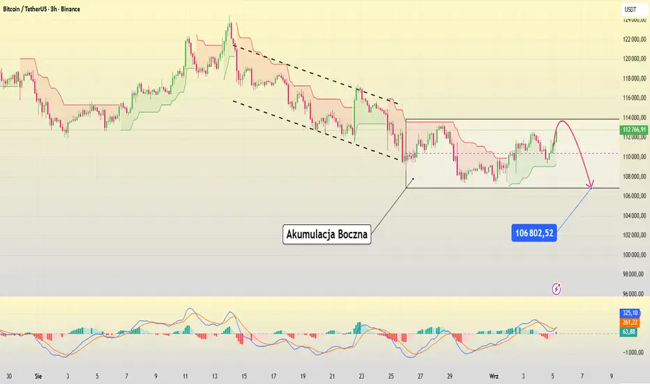 Preferowany scenariusz zakłada, że gdy BTC nie pokona oporu na poziomie 113 tys. USDT, cena prawdopodobnie odwróci się i spadnie, a pierwszym celem będzie strefa wsparcia na poziomie 110 000 USDT, a następnie poziom 106 802 USDT – który pokrywa się z poprzednim dołkiem, a także poprzednią strefą akumulacji. Będzie to ważny próg, który pozwoli określić, czy rynek będzie kontynuował przełamanie trendu spadkowego, czy też utrzyma się, tworząc nową odbudowę.