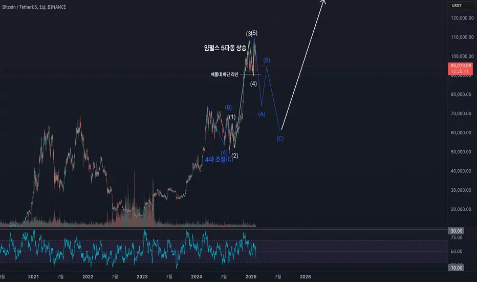 세부 카운팅이 부합하지 않아 4파 조정 이후 올라온 파동이 임펄스일 가능성을 낮게 보았으나 이번 하락 진행으로 가능성이 명확해졌습니다. 현재 신고가가 한 동안은 깨지지 않고 큰 조정 이후에 돌파 될 것으로 생각하고 있습니다. 현재 매물대 하단 지지를 받고 약간의 반등이 나오고 있는 모습이나 반등을 하여도 신고가를 재차 넘기지는 못하고 매물대를 돌파해서 하락 할 것을 예상하고 있습니다. 상당한 시간이 걸릴 수 있으나 결국에는 50,000$~70,000$에 있는 매물대를 향할 것이라고 생각합니다. 이전 분석에도 다루었으나 이 가격대에 도달한다면 현물 매수의 적기라고 생각합니다.