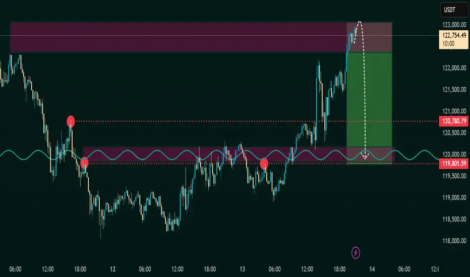 กราฟแสดงให้เห็นว่า BTCUSDT กำลังทดสอบโซนอุปทานสำคัญในช่วง 122,500 – 123,000 USDT ราคาได้พุ่งขึ้นอย่างรวดเร็วสู่บริเวณแนวต้านนี้ ซึ่งเคยเป็นจุดกลับตัวที่สำคัญมาก่อน
