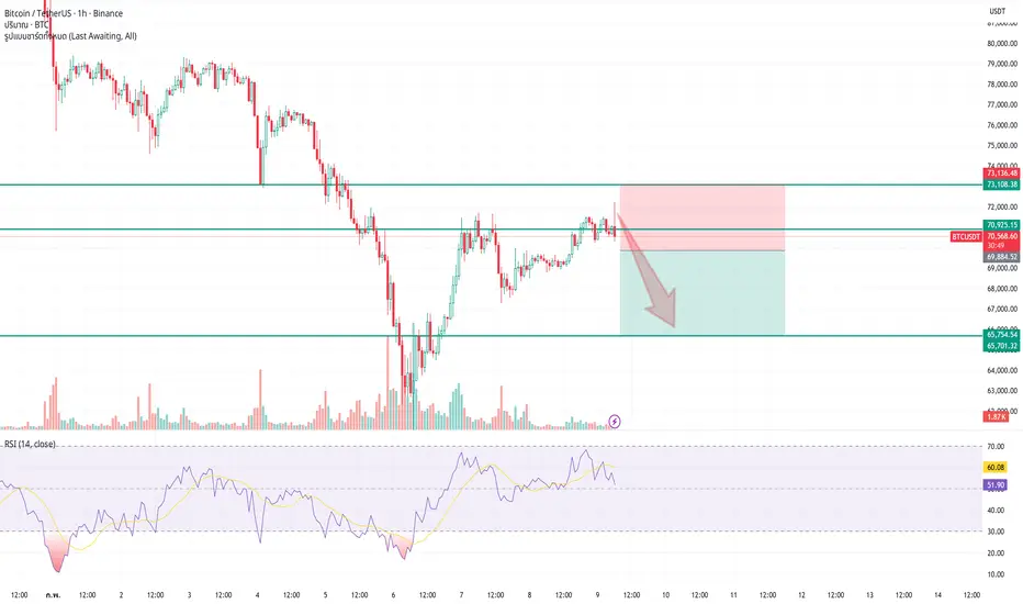 คือ ถ้ามันยืน ที่ราคา 70000 ไม่ได้ มีลุ้น ลงไปทดสอบ โลว เดิม ดังนั้นตั้ง SL สำหรับคนที่มองขึ้นไว้ที่ 70000 ถือว่าปกติ แต่จะโดน Stop Hunt ได้ ต้องมีการขยับ บ้าง