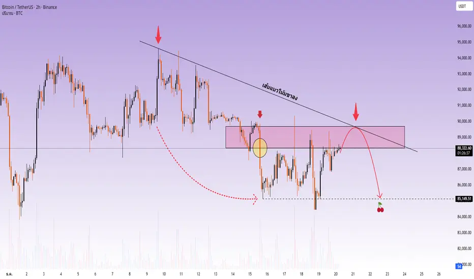 BTC ยังคงถูกกดดันต่ำกว่าเส้นแนวโน้มขาลงระยะยาว บ่งชี้ว่าผู้ขายยังคงควบคุมโครงสร้างหลัก การเคลื่อนไหวขึ้นแต่ละครั้งถูกปฏิเสธอย่างชัดเจน โดยไม่มีสัญญาณการกลับตัวที่น่าเชื่อถือ
