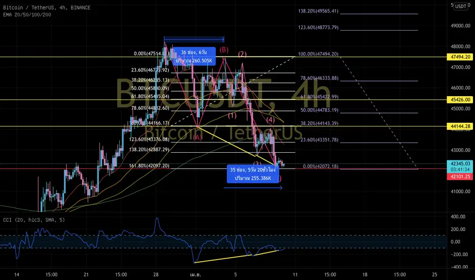 ตอนนี้ราคาได้ลงมาเหยียบ 42,xxx$ แบบเส้นยาแดง ซึ่ง ตรงกับระยะ C Elongated ของ Normal B คือ 138.2%_161.8%+ ของ B ซึ่งเราจะสามารถคำนวนระยะ C Elongated ได้อีกอย่างคือ ระยะเวลาของ C = A + B จากในกราฟ A+B = 6วัน ส่วน C ใช้เวลาผ่านไป 5 วันแล้ว ประกอบกัน ถ้านี้คือ Waves 4 มีโอกาสที่ระยะ C ไม่เกิน หัว 1 ซึ่งตอนนี้ พอดีเปะ ประกอบกับ เวฟย่อยครบเกิด Bull Divergence ที่ waves 3 , 5 ขาลง มีโอกาสส่งผลให้ราคา กลับตัวขึ้นไป เป็น Waves 5 โดยมี 3 แนวต้านที่ตรงผ่าน ซึ่งเป็น แนวต้านตามระยะ รีบาวด์ เส้น 38.2%,61.8% และ 100% ช่วงราคา 44,166$ , 45,445$ และ 47,514$ ตามลำดับ ซึ่งเป็นระยะที่ต้องค่อยเฝ้าระวังสัญญาณกลับตัวเพราะถ้าผ่านขึ้นไปไม่ได้แล้วลากลงมาต่อ หรือ ถ้า Bull Divergence ที่เกิดในครั้งนี้เป็นแค่การพักตัวแล้วลงต่อ แนวคิดในเบื้องต้นที่ได้วิเคราะห์ จะปัดตกไปทันที ก้อนขา C ทั้งก้อนที่ได้วิเคราะห์นี้ จะกลายเป็น Waves 3 ขา C ในภาพใหญ่ ทันทีซึ่งถ้าราคานั้นหลุดลงมาใน กรณีจริงๆ เม่าจะมาวิเคราะห์กราฟในภาพดังกล่าวนั้นให้ดูอีกทีนะคะการวิเคราะห์นี้เป็นเพียงมุมมองจากประสบการณ์ของเม่าเท่านั้น อย่าเพิ่งเชื่อเม่าและนำไปศึกษาต่อตัดสินใจและรับความเสี่ยงด้วยตนเองนะคะ