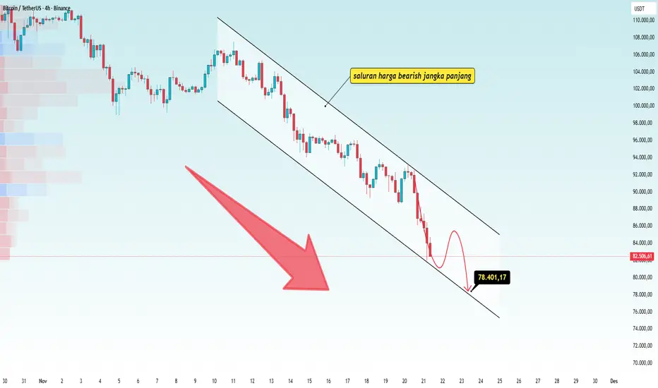 Harga berjalan mendekati bagian bawah saluran turun dari 109k, hanya menciptakan lower high + lower low secara berturut-turut