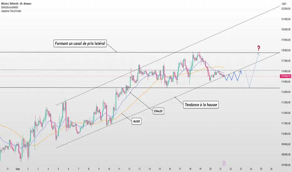 Le Bitcoin continue d'évoluer dans un canal de prix ascendant, les MME20 et MME50 servant toujours de zones de support dynamiques. Malgré une correction à court terme autour de 115 500, la tendance principale reste haussière, la ligne de tendance inférieure du canal de prix n'ayant pas été cassée.