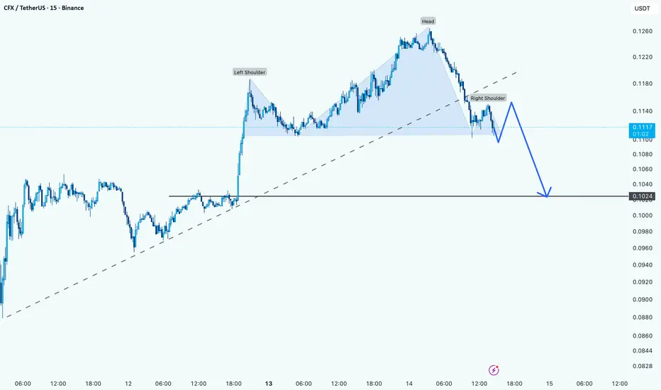 CFX is printing a clean head and shoulders setup on the 15-minute chart. The neckline sits around the 0.1100 zone, which is acting as short-term support right now.