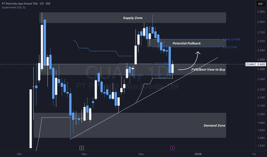 Secara teknikal, CUAN saat ini berada di zona support yang kuat (Rp2.340 - Rp2.430), yang merupakan titik pertemuan Golden Ratio, FVG, dan Uptrend Line.