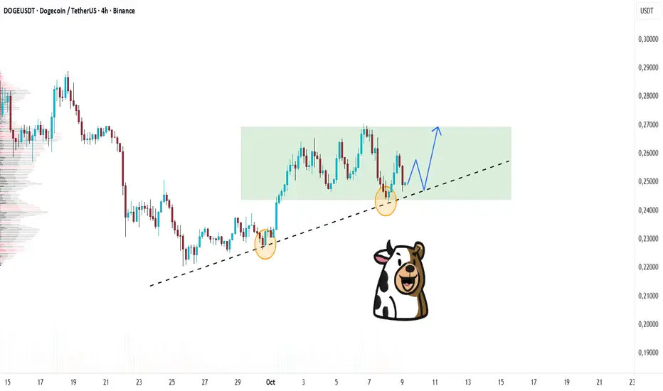 El gráfico muestra que DOGE/USD está operando dentro de un canal alcista con soporte en el nivel de 0.24700. Los próximos objetivos podrían ser 0.27000 (TP1) y 0.28000 (TP2) si la tendencia alcista continúa.