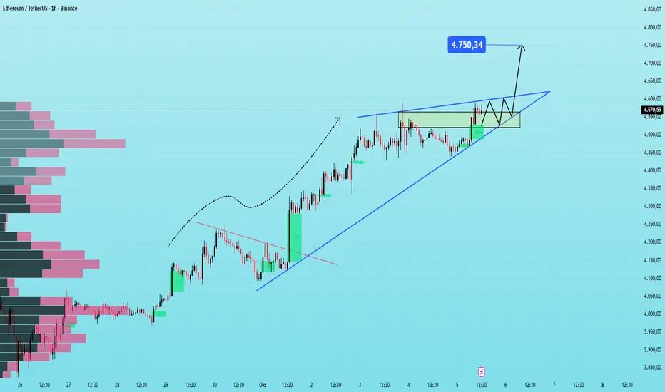 Ethereum (EthusDT) pada Binance terus mempertahankan peningkatan stabil dalam peningkatan irisan. Setelah menyelesaikan fase penyesuaian pendek dan membentuk area FVG sekitar 4.520, harga dengan cepat meningkat lagi, menunjukkan bahwa kekuatan pembelian masih mengendalikan pasar. Struktur lilin telah meningkat dengan stabil dan tren di bawah ini masih dipertahankan, memperkuat peningkatan jangka menengah.