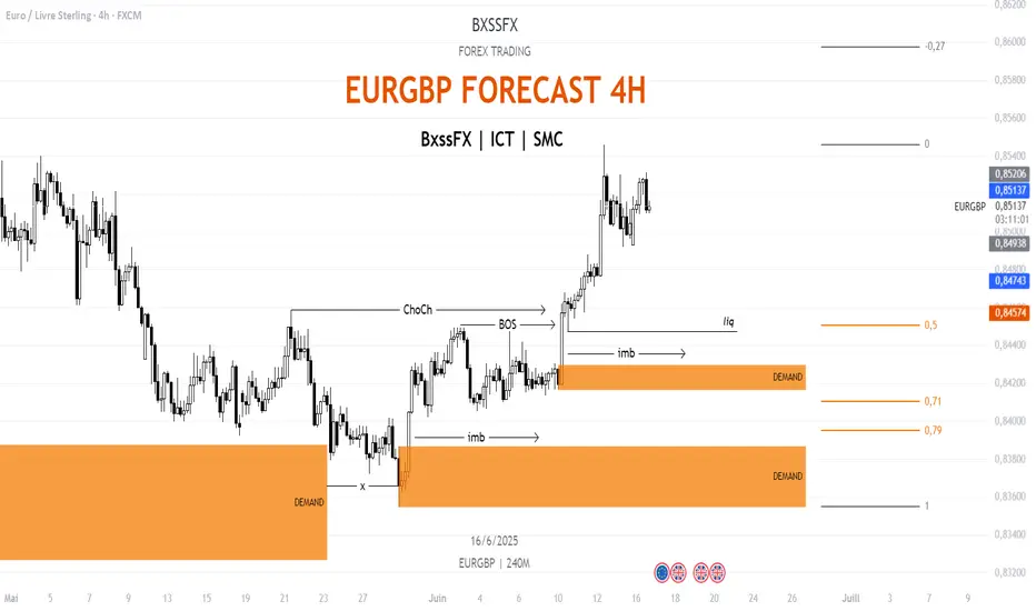 Le prix a récemment balayé une zone de liquidité interne (liq) puis amorcé un repli en direction de la zone de demande + imbalance autour des 0.84150 – 0.84350, en confluence avec les niveaux 0.5 / 0.71 / 0.79 de retracement Fibonacci.