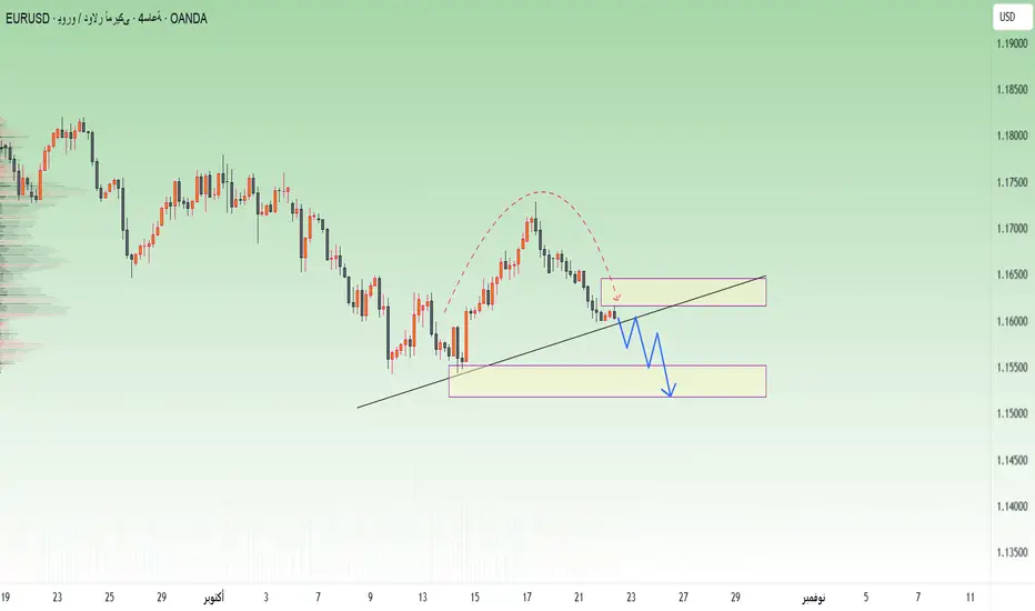 على الرسم البياني، كسر زوج EURUSD الاتجاه الصاعد قصير المدى، وارتد قليلًا نحو منطقة 1.1610 قبل أن يتوقف – وهي إشارة كلاسيكية إلى تصحيح مؤقت قبل الهبوط العميق. وإذا استمر الزخم البيعي، فقد يكون الهدف التالي عند 1.1520، حيث سيحاول المشترون الدفاع عن مواقعهم قبل أي انهيار أعمق.