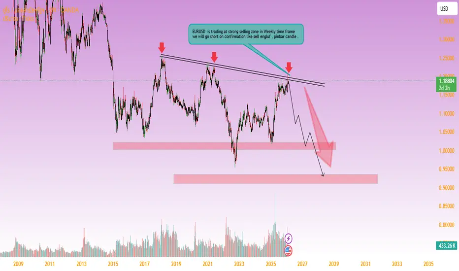 EURUSD อยู่ในโซน supply/แนวต้านรายสัปดาห์ พร้อม trendline ขาลง HTF