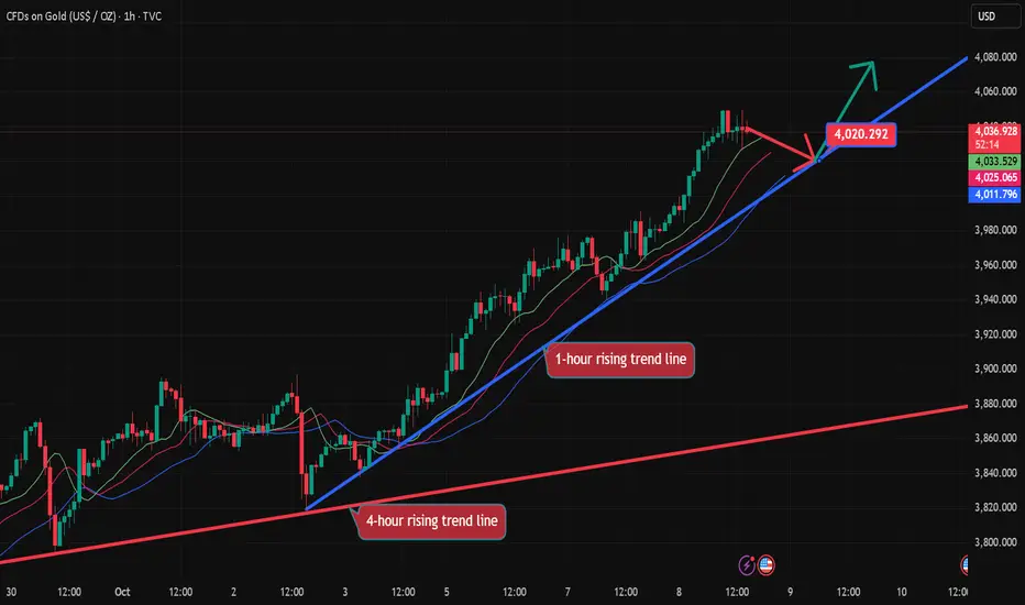 Gold prices continued to fluctuate at high levels in the early stages of the U.S. trading session on Wednesday (October 8), with the potential for further gains. At the same time, the current price increase has already reached a large extent. Pursuing long positions at the current price is not the best opportunity. Waiting for a pullback to trade long positions at support points, with small stop-loss orders and a large expected profit range, spot gold broke through the $4,000 mark during the day, reaching a record high of $4,049.43 before retreating slightly. The current rise in gold prices is driven by strong safe-haven demand, driven by factors including the U.S. government shutdown, falling Treasury yields, and political turmoil in Europe and Japan.