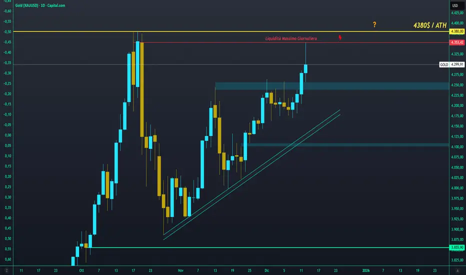 Data la chiusura giornaliera di venerdì, io penso che possa ripartire un po' LONG fino a liquidare il massimo giornaliero di Venerdì stesso dei 4353$ o a limite il massimo storico dei 4380$ per oncia.