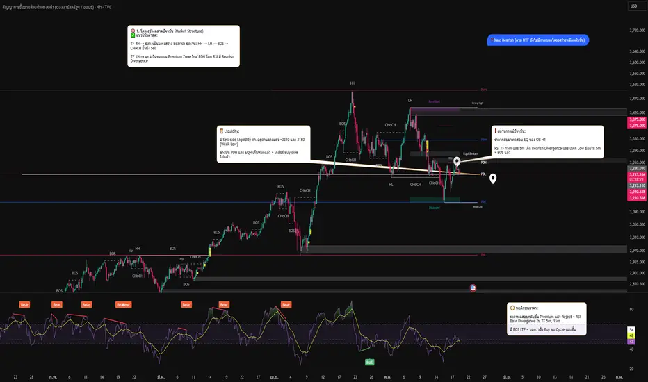🔹 โครงสร้างหลัก: Bearish (TF 4H ยังเป็น LH และยังไม่มีเบรกขึ้น)