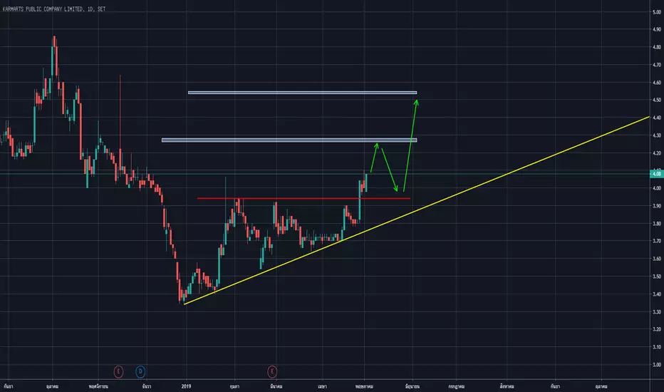 ราคาน่าจะวิ่งไปหา 4.26 ก่อนแล้วค่อยย่อลงมาแล้วถ้าไม่หลุดแนวโน้มเส้นเหลือง ราคาก็น่าจะวิ่งไปหา 4.54