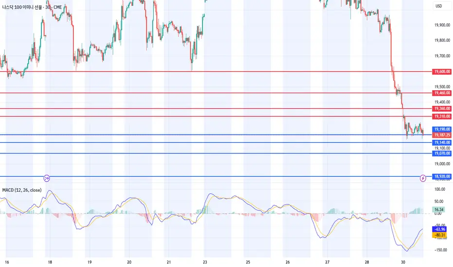 나스닥은 경기침체 우려가 부각되며 장대음봉으로 하락마감하였습니다. 일봉상 볼린저밴드 하단선 부근까지 하락한 모습으로, MACD가 Signal선에 다시 붙으려고 하면서 조정받은 모습입니다. 주봉상으로는 5주선 살짝 위에서 저항받으며 윗꼬리 달고 하락하였는데, MACD가 가파르게 하락하고 있고 Signal선도 하락추세에 있는 만큼 하방으로 오버슈팅 이후에 바닥을 다지는 움직임을 그려줄 가능성도 있겠습니다. 일봉으로 본다면 1차 19000부근과 2차 18500부근이 될텐데, MACD가 아직 Signal선을 하방이탈하지는 않았으나, 데드크로스 진행 시 매도3파가 강하게 나타날 수 있으니 매수 포지션에 있어서는 주의를 하는 게 좋겠습니다. 다만 아직 MACD가 Signal선을 데드크로스 하지 못한 상황이고, Signal선을 지지삼아 반등할 수도 있기 때문에 확실히 추세가 돌아서는지를 확인하면서 매수대응 하는 게 좋겠습니다. 240분봉상으로는 매도시그널이 강하게 나와주면서 하락폭이 굉장히 가파른 상황입니다. 2월 21일 있었던 움직임과 비슷한 타츠를 형성하고 있는데, 바닥이 어디인지 아직 확인할 수 없으니 최대한 보수적으로 대응하시기 바랍니다. 매도 대응 시에는 일봉상 3일선에서 대응해볼 수 있겠으며, 매수 대응 시 볼린저밴드 하단선을 기준으로 짧게 대응해볼 수 있겠습니다. 오늘 월봉이 마감되는 날이라 월봉상 20월선까지 도달할지, 아래꼬리를 조금이나마 달아주며 마무리될지 체크하시기 바랍니다.