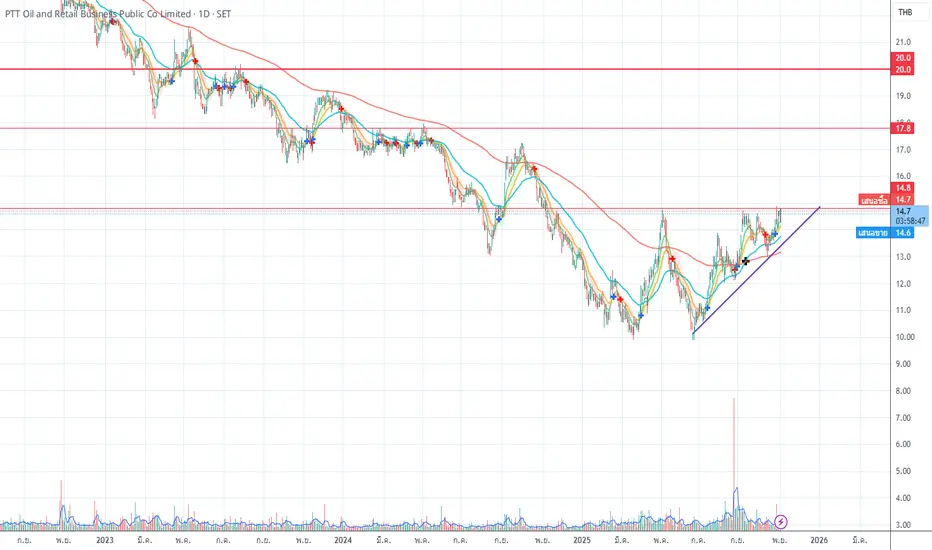 OR มาถึงจุดที่อาจจะมีการ Break out 14.8 ส่วน Chart pattern มองทางด้านล่าง เป็น Duble bottom และส่วน indicator โดยรวมก็ดูดี ถ้าผ่านได้มีโอกาสจะเป็ช่วงขาขึ้น เบื้องต้น และมีแนวต้านแรก 17.8