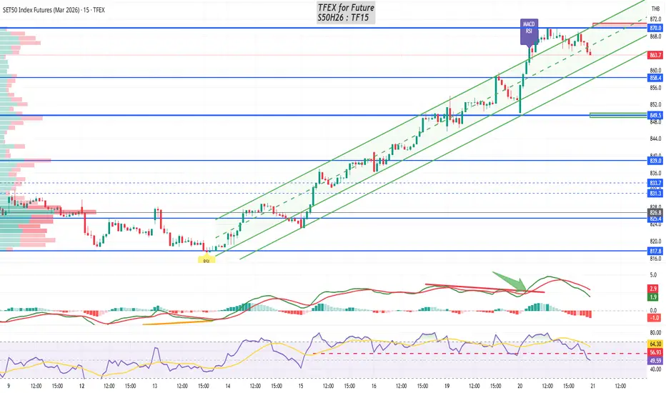 📉 Outlook&Tactical Plan : ระยะสั้น Break BearishDivergence(ลูกศรเขียว) ยืนยันเทรนขาขึ้นระยะสั้นเดินหน้าต่อสวย เป้าหมายสำคัญวันนี้ 870 (Highเดิม) — หากผ่านได้ โซนบนเปิดโล่ง จุดรับ 860 กรอบล่างของเทรนด์