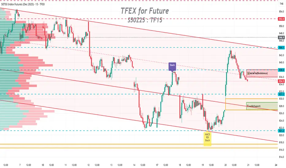 🔹Trend : ยืนยัน SidewayDown (กรอบแดง) แม้มี Rebound แต่ตรงแนวต้าน 845 มีแรงขายชัดเจน คาดผ่านยาก วันนี้เสี่ยงลงต่อ โดยมีเป้า Gap ที่เปิดไว้ 828