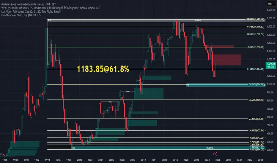 • จุดอ้างอิง Fibonacci: High ปี 1994 (1789.16) → Low ปี 1998 (204.59)