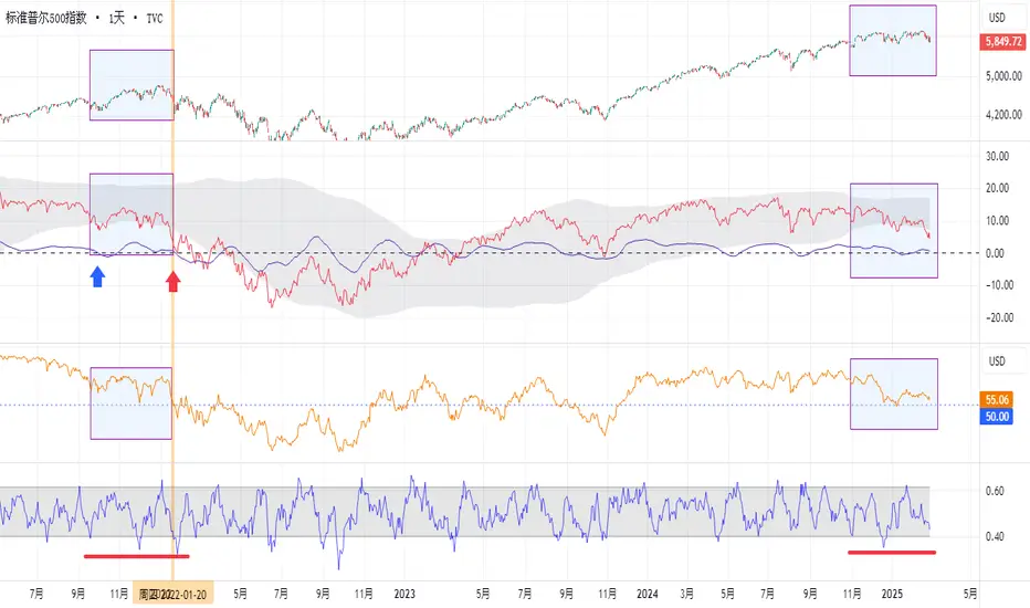 这次不看周线看日线。看标普250天移动标准差,这次只对比2022年1月的下跌。用上250天,因为这等同周线的52个单位。这里会看到神奇相似。不是100%,也像八九成,包括我用上最下方标示的breadth thrust指标。
