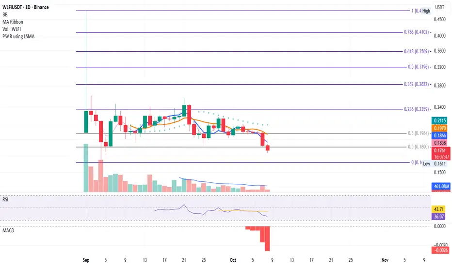 WLFI has lost the 0.1984 level as support and is now testing 0.1800 USD, which marks the lowest daily close on record.