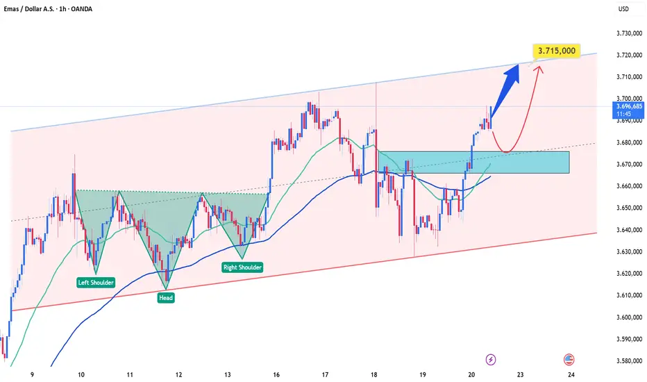 Sejalan dengan itu, emas juga bergerak stabil di dalam channel naik yang jelas. Dengan momentum saat ini, target penting berikutnya berada di sekitar 3.715 USD, mendekati batas atas channel.