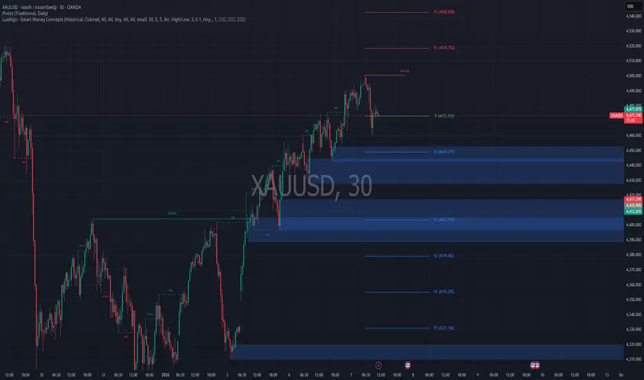 ในเชิงเทคนิค Timeframe H4 ยังคงเป็นโครงสร้างขาขึ้นที่แข็งแกร่ง (Strong Bullish Structure) ราคายืนเหนือเส้น Daily Pivot ที่ $4,473 ได้อย่างเฉียดฉิว แต่ใน Timeframe ย่อย H1 และ M15 เริ่มเห็นสัญญาณการย่อตัวทำ Lower High ลงมา ซึ่งถือเป็นเรื่องดีสำหรับขา Buy ที่ตกรถ เพราะนี่คือจังหวะ "ย่อตัวเพื่อขึ้นต่อ" กลยุทธ์วันนี้จึงเน้นรอช้อนซื้อแถวแนวรับ Pivot หรือ S1 ($4,449) โดยมีเป้าหมายการทำกำไรระยะสั้นที่ High เดิม $4,500 และแนวต้านถัดไปที่ $4,518วิเคราะห์ราคาทองคำ (Gold Analysis): 07 มกราคม 2568