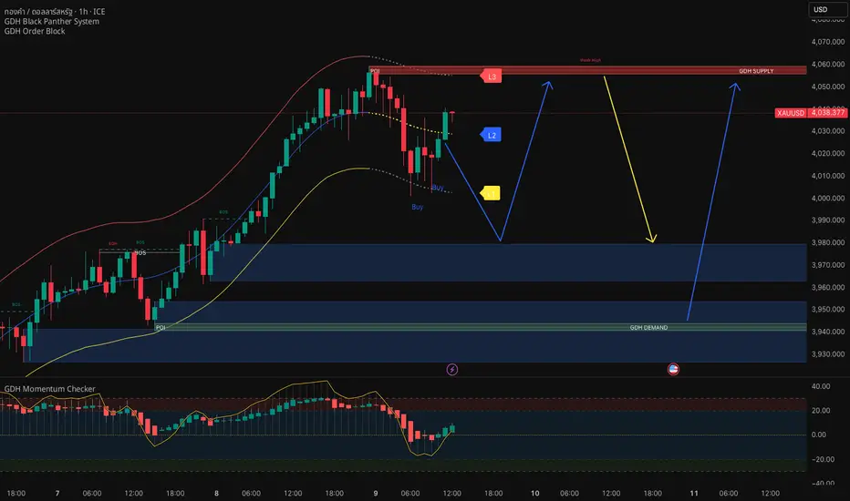 ราคาทองอยู่ในช่วง ขาขึ้นต่อเนื่อง (Strong Bullish Trend) ตั้งแต่เบรก BOS บริเวณ 3600 จนขึ้นมาทดสอบเหนือ 4000 แต่เริ่มมี สัญญาณ Sell ปรากฏบริเวณ 4050 ซึ่งมักเป็นจุด “พักหรือกลับตัวสั้น ๆ โครงสร้างยังไม่หลุด BOS ล่าสุด → ยังถือเป็น “การพักตัวในเทรนด์ขาขึ้น” มากกว่ากลับตัว