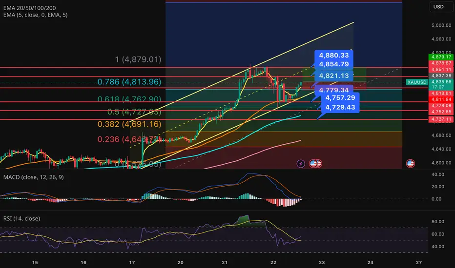 เมื่อวัดจากจุดต่ำสุดที่ 4,535.22 ดอลลาร์ ไปยังจุดสูงสุดที่ 4,889.37 ดอลลาร์ พบว่าระดับ Fibonacci Retracement 38.2% ที่ 4,754.08 ดอลลาร์ ทำหน้าที่เป็นแนวรับแรก ขณะที่ระดับ 23.6% ที่ 4,805.79 ดอลลาร์ เป็นจุดชี้วัดทิศทางระยะสั้น หากราคาสามารถทะลุขึ้นเหนือแนวนี้ได้อย่างชัดเจน จะช่วยตอกย้ำมุมมองเชิงบวก แต่หากหลุดต่ำกว่าแนวรับแรก จะเปิดความเสี่ยงต่อการปรับฐานลงสู่ระดับ 50% ที่บริเวณ 4,712.29 ดอลลาร์