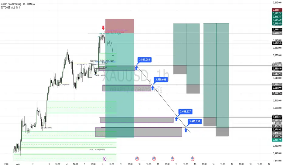 - จุดเข้า Sell เกิดใกล้ OB H1, SL เหนือ High 3,618, RR ~1:3-1:4