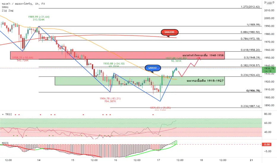 ทองคำเช้านี้ยังกลับมายืนอยู่ในกรอบแนวต้านซึ่งเป็นแนวรับเดิมบริเวณ 1927-1939 ดอลลาร์ต่อออนซ์ โดยหากราคาทองคำยังสามารถผ่านแนวดัวกล่าวขึ้นไปได้นั้น อาจจะเห็นทองคำปรับตัวขึ้นเหนือระดับ 1950 ดอลลาร์ต่อออนซ์อีกครั้ง ทั้งนี้ในระดับ 1940 ดอลลาร์ต่อออนซ์เราอาจเห็นช่วงปรับฐานราคาระยะสั้นในบริเวณดังกล่าวได้ จึงควรติดตามจังหวะที่ราคาทองคำปรับฐานจาการเข้าทำกำไรระยะสั้นนั้น หากราคายังไม่หลุดแนวรับ 1927 ดอลลาร์ต่อออนซ์ ตรงนี้จะเป็นจังหวะที่เราจะสามารถเข้าทำกำไรโดยเสี่ยงเปิดคำสั่งซื้อได้อีกครั้ง