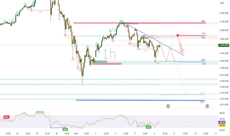 ทิศทางหลักยังเป็น Bearish (ขาลง) ตราบใดที่ราคายังไม่สามารถ Breakout ทะลุเส้นเทรนด์ไลน์และยืนเหนือโซน $4,947 ได้ การดีดตัวขึ้น (Rebound) ควรมองเป็นโอกาสในการพิจารณาฝั่งขายตามเทรนด์หลัก มากกว่าการไล่ซื้อสวนเทรนด์ครับ