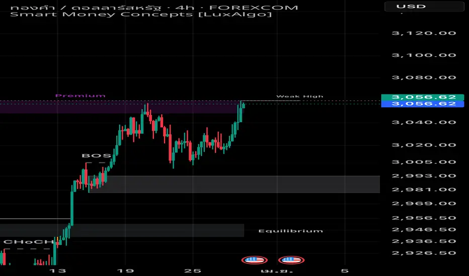 • ราคาเข้าสู่โซน Premium Zone (~3,050–3,060) ซึ่งเป็นโซนที่ Smart Money อาจเริ่ม ขายทำกำไร หรือ พักตัว