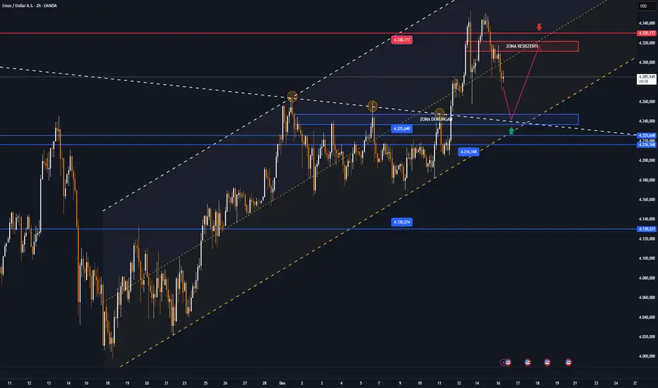 Harga emas memasuki koreksi teknis yang sehat setelah gagal menembus zona resistensi dekat level tertinggi sepanjang masa di sekitar 4.330 USD. Pada timeframe harian, struktur tren naik tetap utuh, karena higher low masih terbentuk dan harga terus berfluktuasi dalam kanal naik jangka menengah.