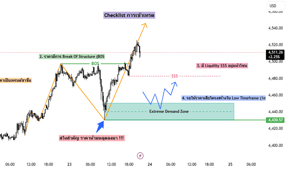 มุมมองทองคำกรอบเวลา 15 นาทีทองคำยังคงเป็นเทรด์ขาขึ้นอย่างต่อเนื่องหลังจากราคาได้ทำ All Time High ทำให้ไม่มีโซนแนวต้าน หรือ Supply Zone ที่จะทำให้ราคาโดนกดลงมา ดังนั้นเราจึงต้องเทรดหน้า Buy ตามเทรนด์ที่เขาสร้างขึ้น โดยใช้ระบบเทรด SMC ตามรูปภาพในกราฟ โดยมีสวิงสำคัญ 4,430$ หากมีราคาสามารถหลุดลงมาได้ เราจะมองเป็น CHoCH ราคาอาจจะเปลี่ยนกลับเป็นเทรนด์ขาลงระยะสั้นได้ครับ