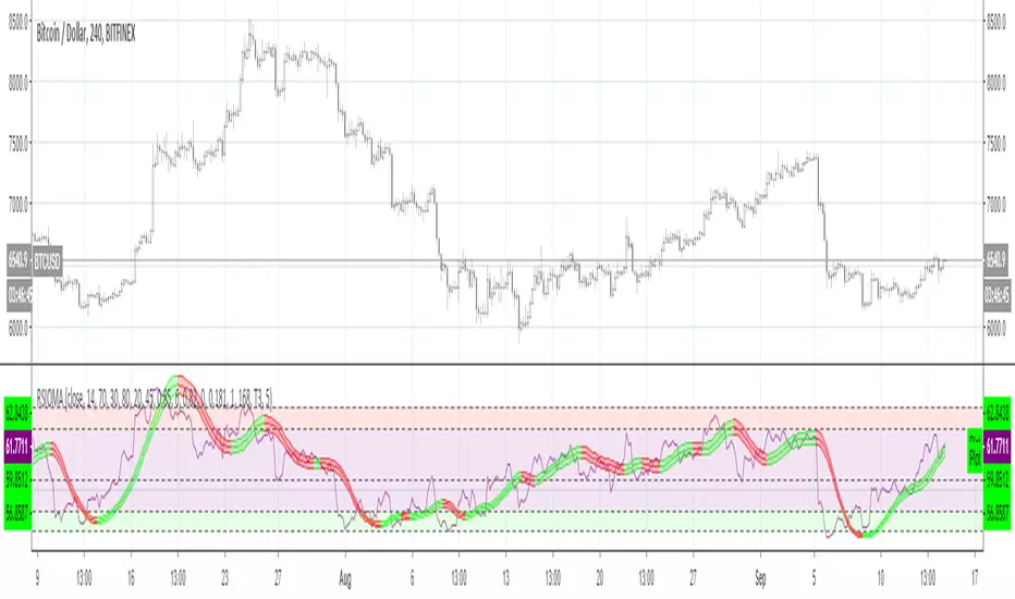 RSIOMA is the abbreviation for Relative Strength index (RSI) of moving averages (MA). This custom built indicator is based on calculating the relative strength of two moving averages and the smoothes out the RSI using a moving average. Combined, the RSIOMA oscillator depicts trend changes in prices relative to the time frame. The RSIOMA can be used as a signal generator by itself. (ProfitF.com)