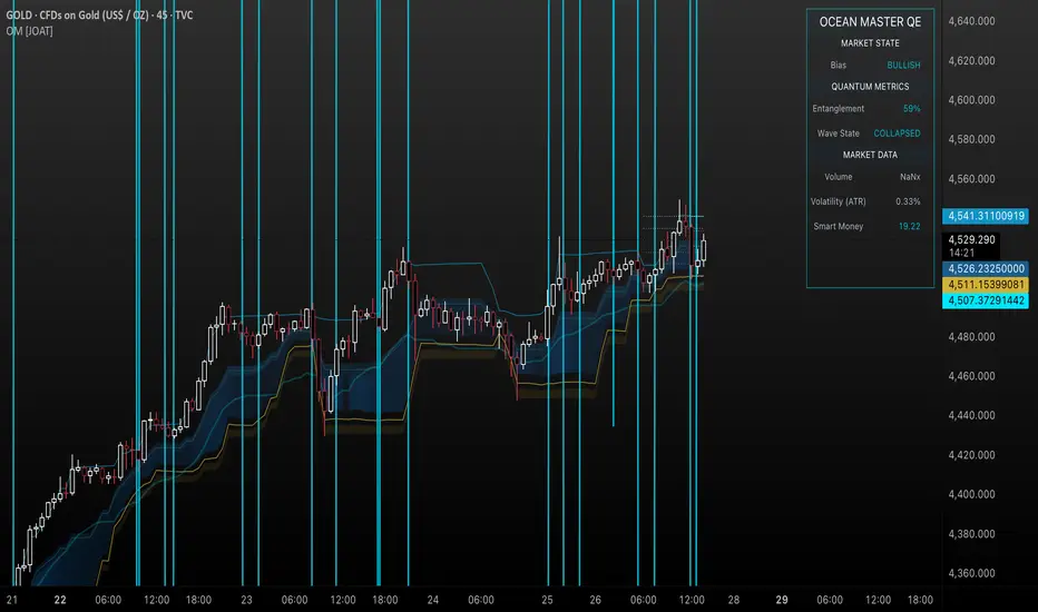 Ocean Master QE is an open-source overlay indicator that combines multiple analytical techniques into a unified market analysis framework. It uses ATR-based dynamic channels, volume-weighted order flow analysis, multi-timeframe correlation (quantum entanglement concept), and harmonic oscillator calculations to provide traders with a comprehensive view of market conditions.