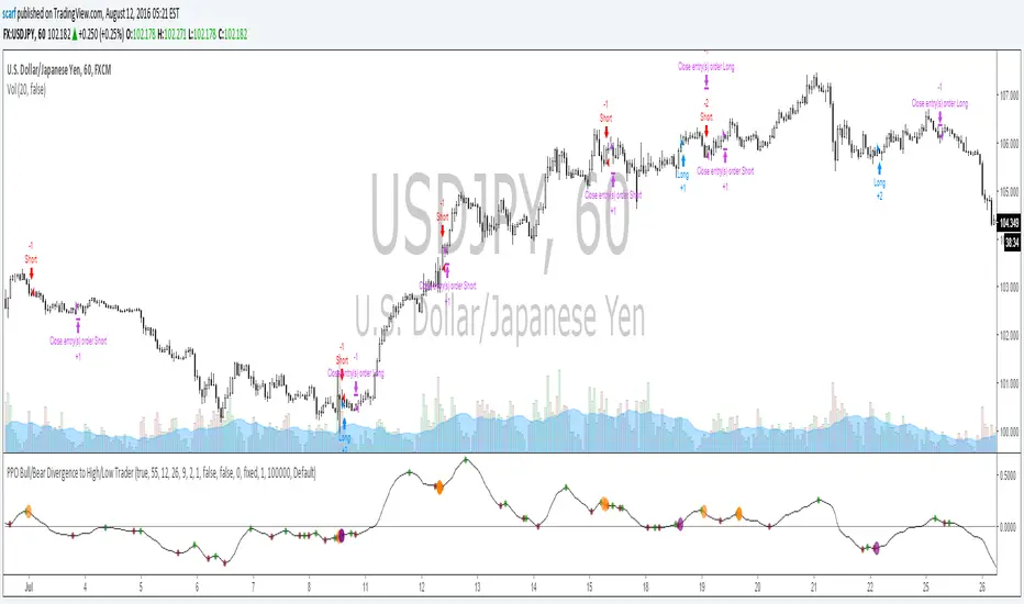 A simple strategy that uses the PPO divergences to open trades and the highs/lows to close them. Credit to Pekipek for this PPO Divergence indicator (I changed the visuals a bit)